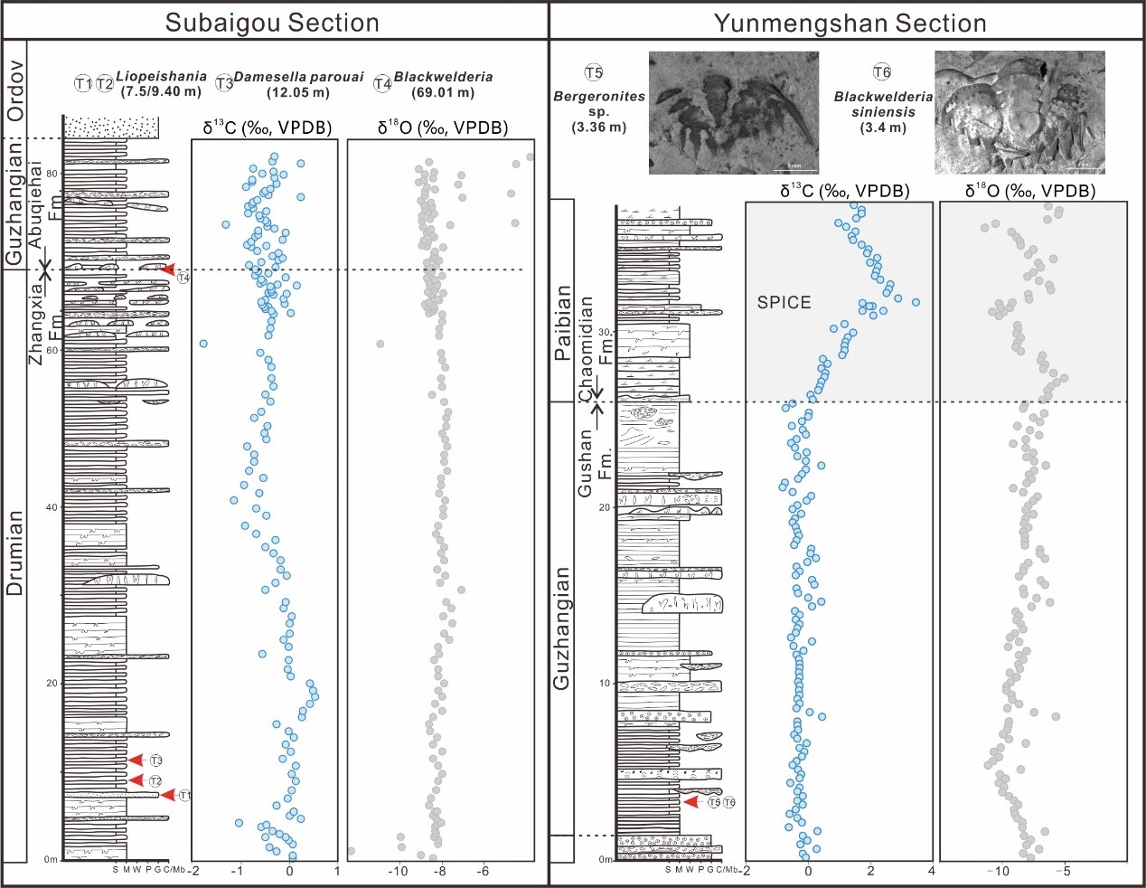 图1. 研究剖面碳同位素曲线与三叶虫化石记录