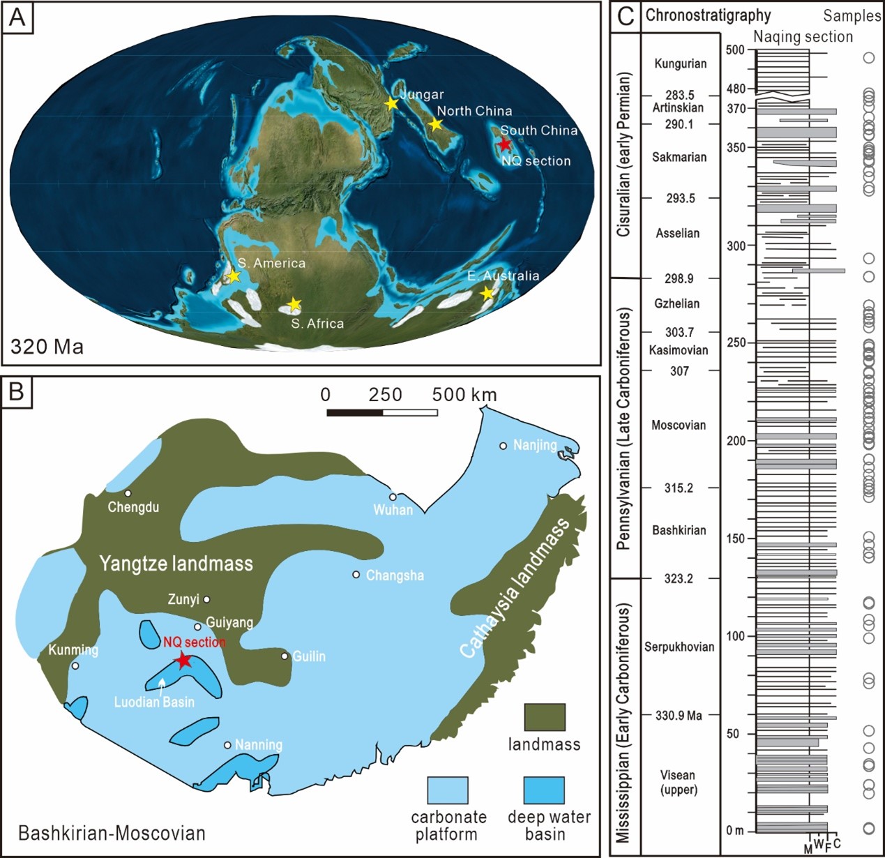 石炭–二叠纪全球与华南古地理图与贵州罗甸盆地纳庆剖面研究层段的岩性柱状图