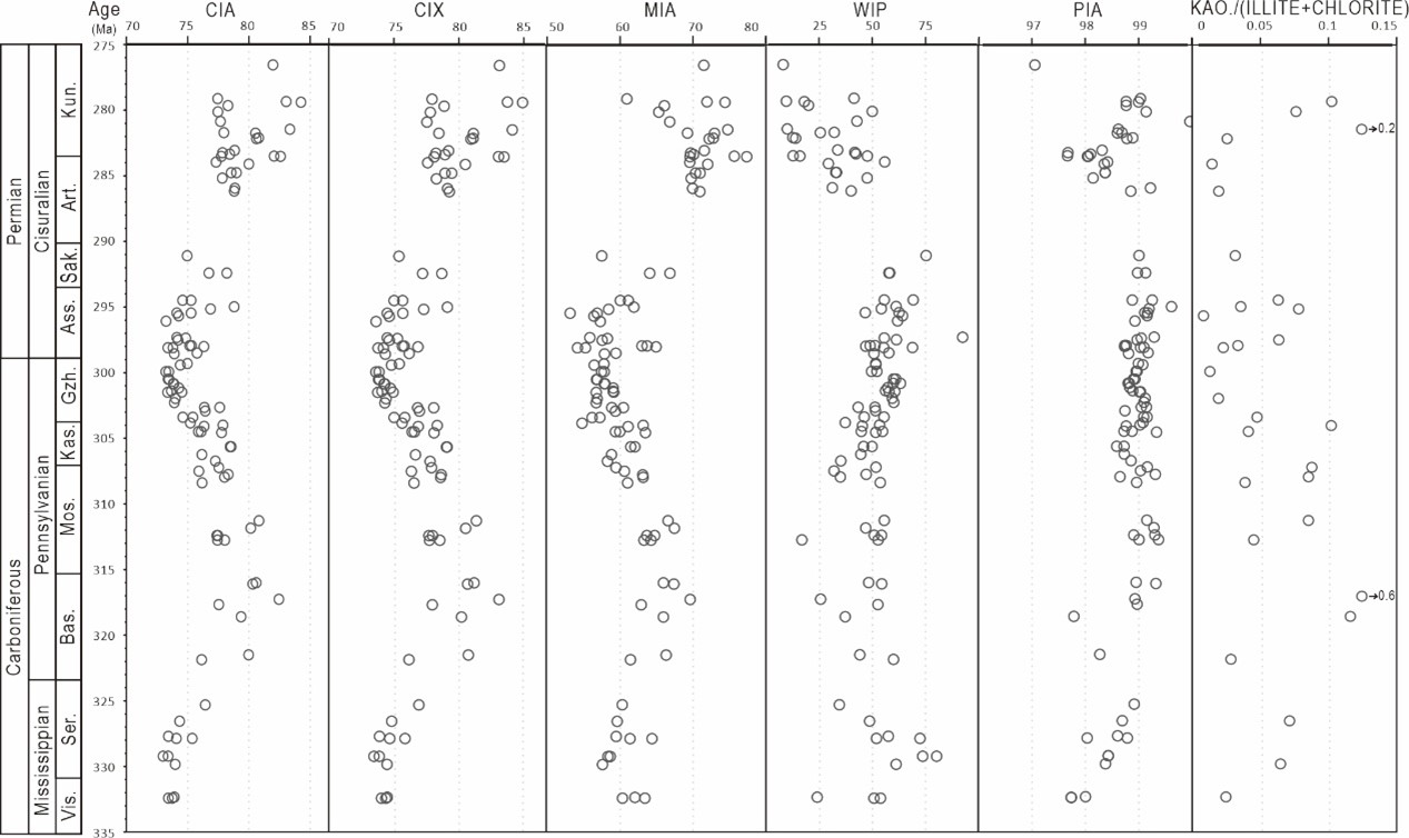 近日,中国科学院南京地质古生物研究所晚古生代团队高彪博士联合团队成员徐国真博士和博士研究生杨文莉,在研究员陈吉涛的组织带领下,对华南贵州罗甸盆地下石炭系至下二叠系(333–275 Ma)的深水碳酸盐岩沉积建造中薄层钙质泥岩夹层开展了高时间分辨率的主微量元素和黏土矿物组分研究,从而获得了第一条晚古生代大冰期长时间尺度的化学蚀变指数(CIA)曲线;同时,结合该时段的锶-锂同位素、大气CO2浓度、中-高纬度地区冰川沉积记录以及火山活动、植被演化等地质事件,综合探讨了该时段全球大陆风化主要影响因素及其风化作用机制的演化过程。相关成果最近发表于国际地学自然指数期刊《地球物理研究通讯》(Geophysical Research Letters)上。