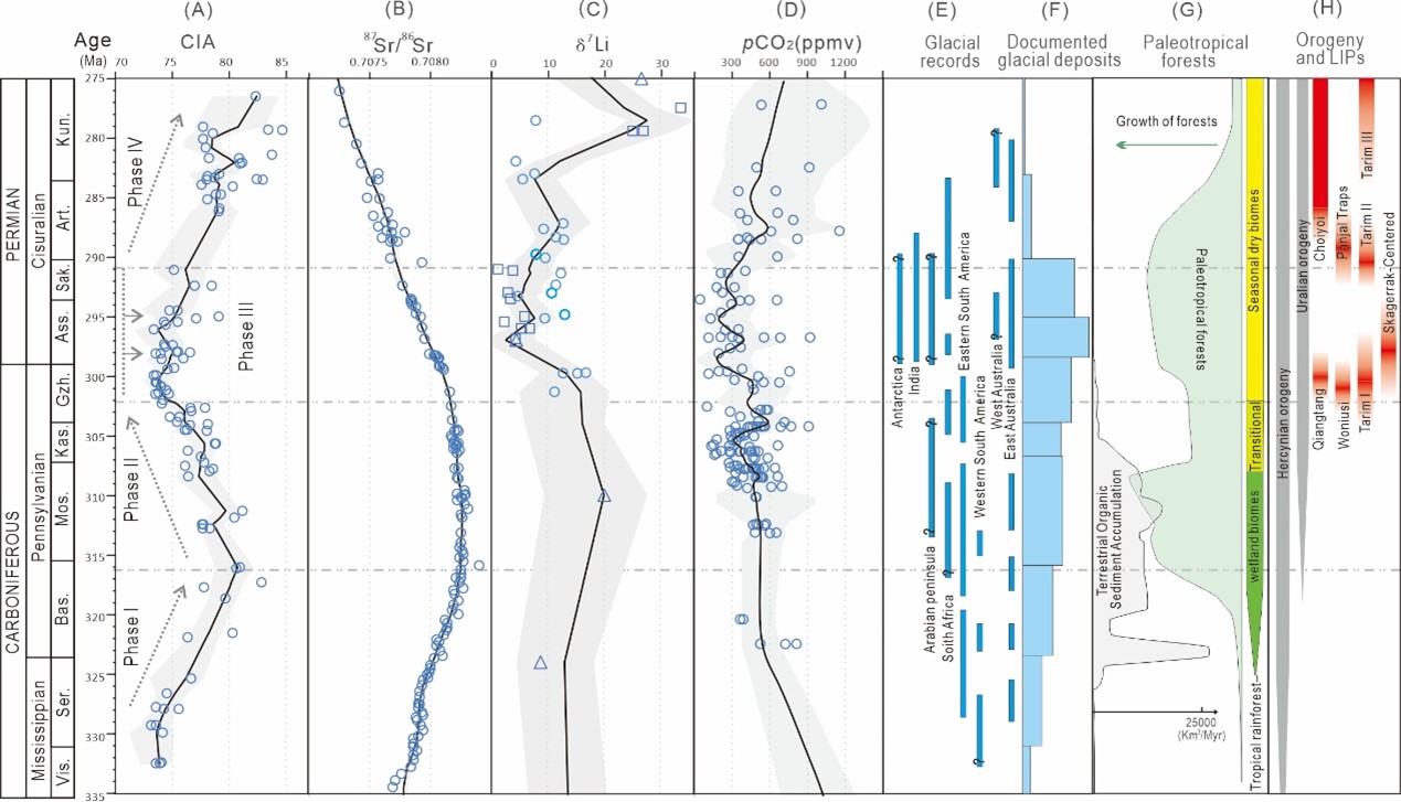 晚古生代大冰期启动于泥盆纪-石炭纪之交(-360 Ma),于二叠纪早期(-290 Ma)主幕结束,是地球自陆地出现维管类高等植物和复杂生态系统以来,唯一记录了全球从“冰室”向“温室”气候转变的地质时期。此外,该时期与新生代冰期大气CO2和O2浓度可较好类比。大量研究表明,泛大陆低纬度地区的海西造山运动与陆地植物演化与扩张,均可通过提高大陆硅酸盐风化速率,致使大气CO2浓度降低,从而驱动和调节晚古生代大冰期的演化。阐明这两大驱动因素如何影响大陆硅酸盐风化作用,对于理解晚古生代大冰期的古气候动力学至关重要。
