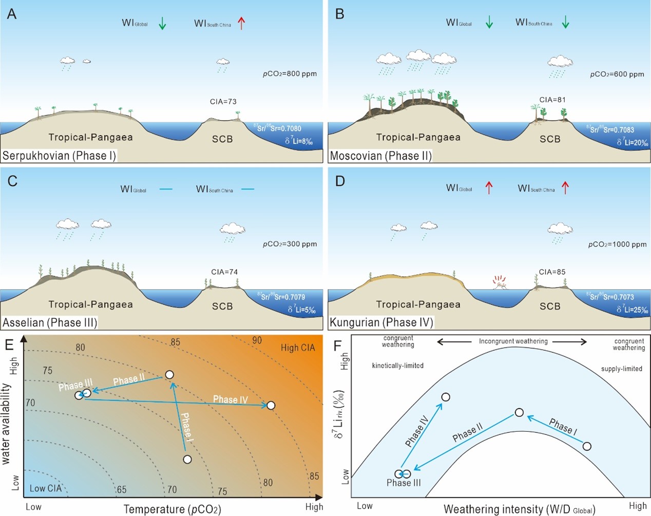 研究发现,贵州纳庆剖面的CIA记录显示清晰的区域风化强度的四个阶段演化过程。其中,在晚石炭世–早二叠世时期(316–275 Ma)其与大气CO2浓度变化基本耦合,指示了华南区域大陆风化强度主要受温室气体(气候)的控制。然而在早石炭世晚期–晚石炭世早期(333–316 Ma),在大气CO2浓度下降、大陆冰川体积扩张及气候变冷的背景下,华南大陆风化强度却呈现增强趋势,表明另有其他强迫因素。基于相关数据分析,排除了物源、沉积物粒度及成岩作用等干扰因素影响,综合对比同时期的地质记录,表明古热带雨林的扩张是其最合理的驱动来源。