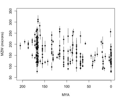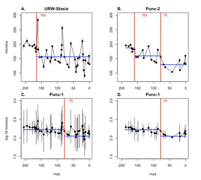 研究团队对200个晚三叠世至今的“Berenicea”形态型苔藓动物样本进行测量,发现其个虫最大宽度随时间显著下降。研究者运用多种时间序列模型,分析了氧气水平变化、唇口目苔藓动物的起源速率及其在群落中所占比例等潜在因素对个虫体型的影响。结果表明,尽管氧气水平与个虫大小在统计上存在一定相关性,但因果关系薄弱。同样,唇口目作为空间竞争的优势类群,其兴起也并未直接导致“Berenicea”个虫缩小。此外,还排除了样本所处(古)纬度(温度)变化对个虫大小的潜在影响。综合分析表明“Berenicea”个虫缩具有内在性,且缩小过程并非匀速,而是在约1.65亿至1.6亿年前和约7800万年前出现两次显著的阶段性缩小。