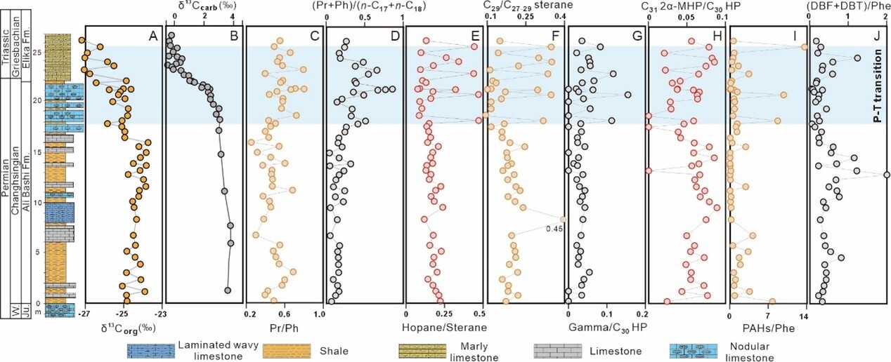 近期,中国科学院南京地质古生物研究所晚古生代团队博士研究生角升林在研究员张华的指导下,联合团队其他成员和南京大学以及伊朗洛雷斯坦大学同行,对伊朗西北部二叠–三叠系界线Zal剖面开展了高精度生物标志物分析(图1)。相关成果近日发表于国际地学期刊《古地理、古气候、古生态》(Palaeogeography, Palaeoclimatology, Palaeoecology)。