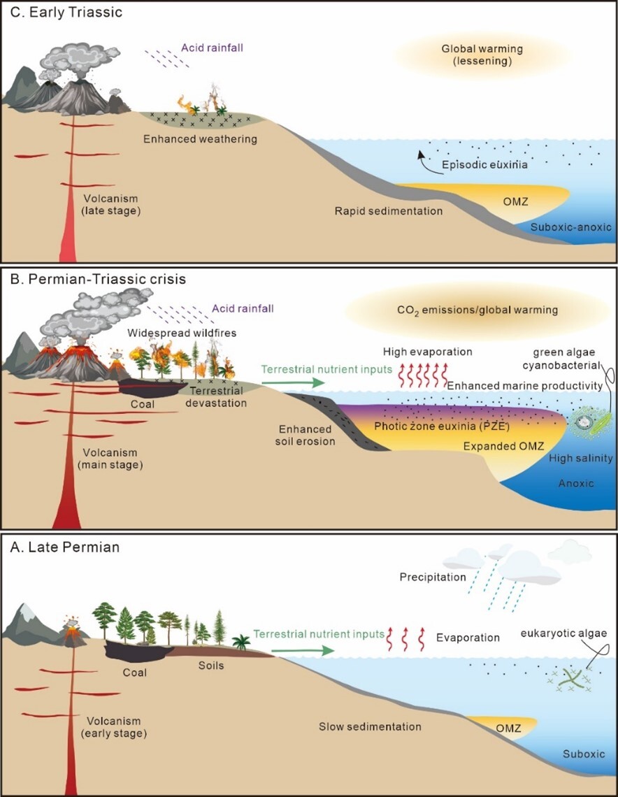 图4 晚二叠世至早三叠世海陆系统海洋缺氧和生态扰动的概念模型
