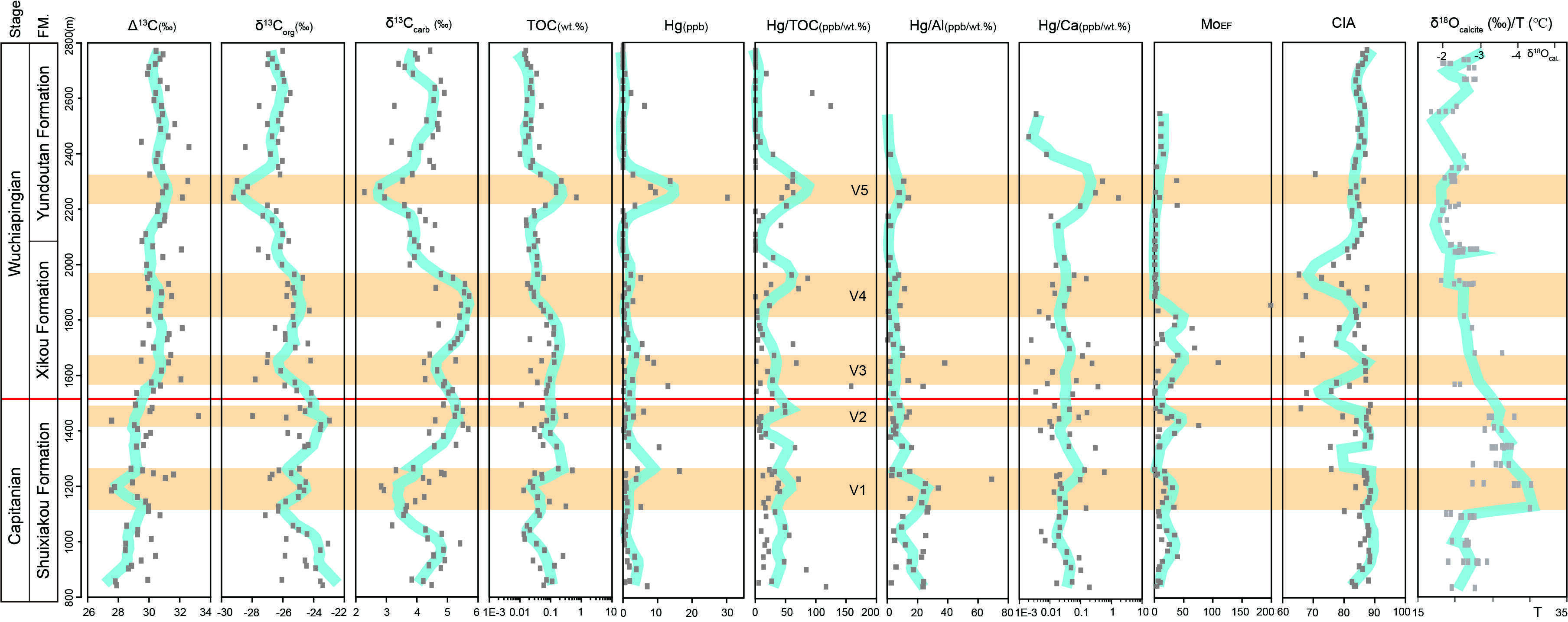 研究团队选取南秦岭陕西镇安西口剖面连续出露的碳酸盐岩序列,开展了系统的汞地球化学、碳同位素(δ13Ccarb和δ13Corg)、氧化还原敏感微量元素及化学风化指标等多参数分析。结果显示,在卡匹敦期至吴家坪期地层中识别出五次显著的汞异常脉冲(Hg/TOC峰值最高达150 ppb/wt%),每次脉冲均伴随明显的负碳同位素偏移(最大达-2.5‰)、化学风化指数升高(CIA最高达88)以及氧化还原敏感元素同步富集(MoEF最高达100)(图1)。