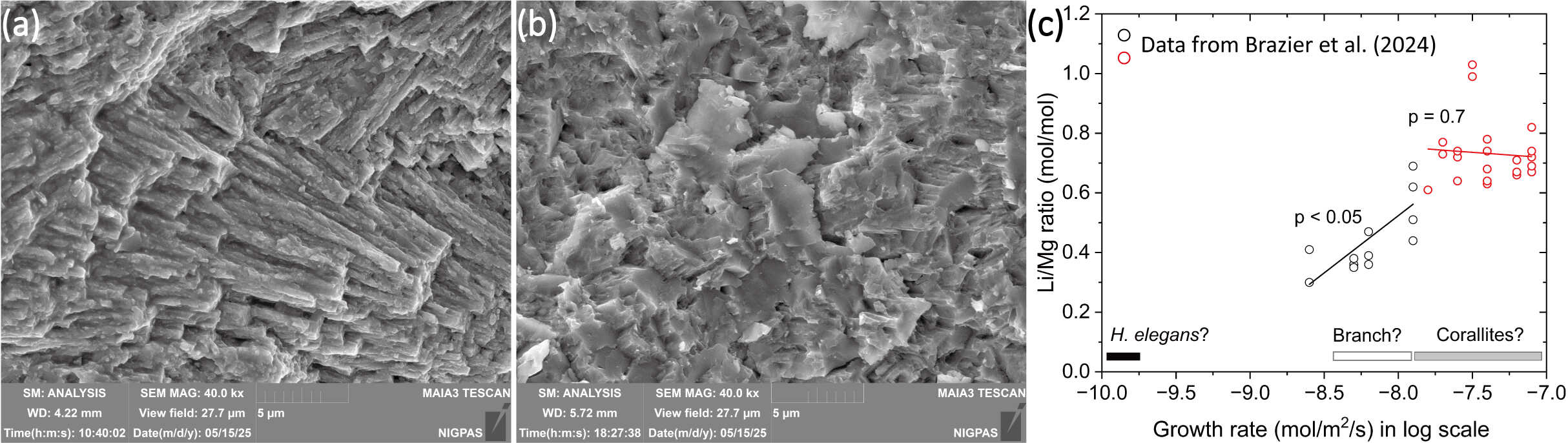 珊瑚不同骨骼的SEM照片(a)珊瑚杯(b)主干以及生长速率对Li/Mg比值的影响