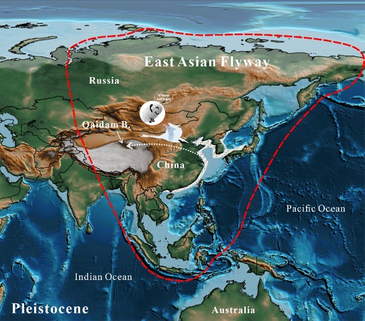 图2 海相介形类通过水鸟由西太平洋沿岸海域向柴达木古湖的长距离扩散示意图
