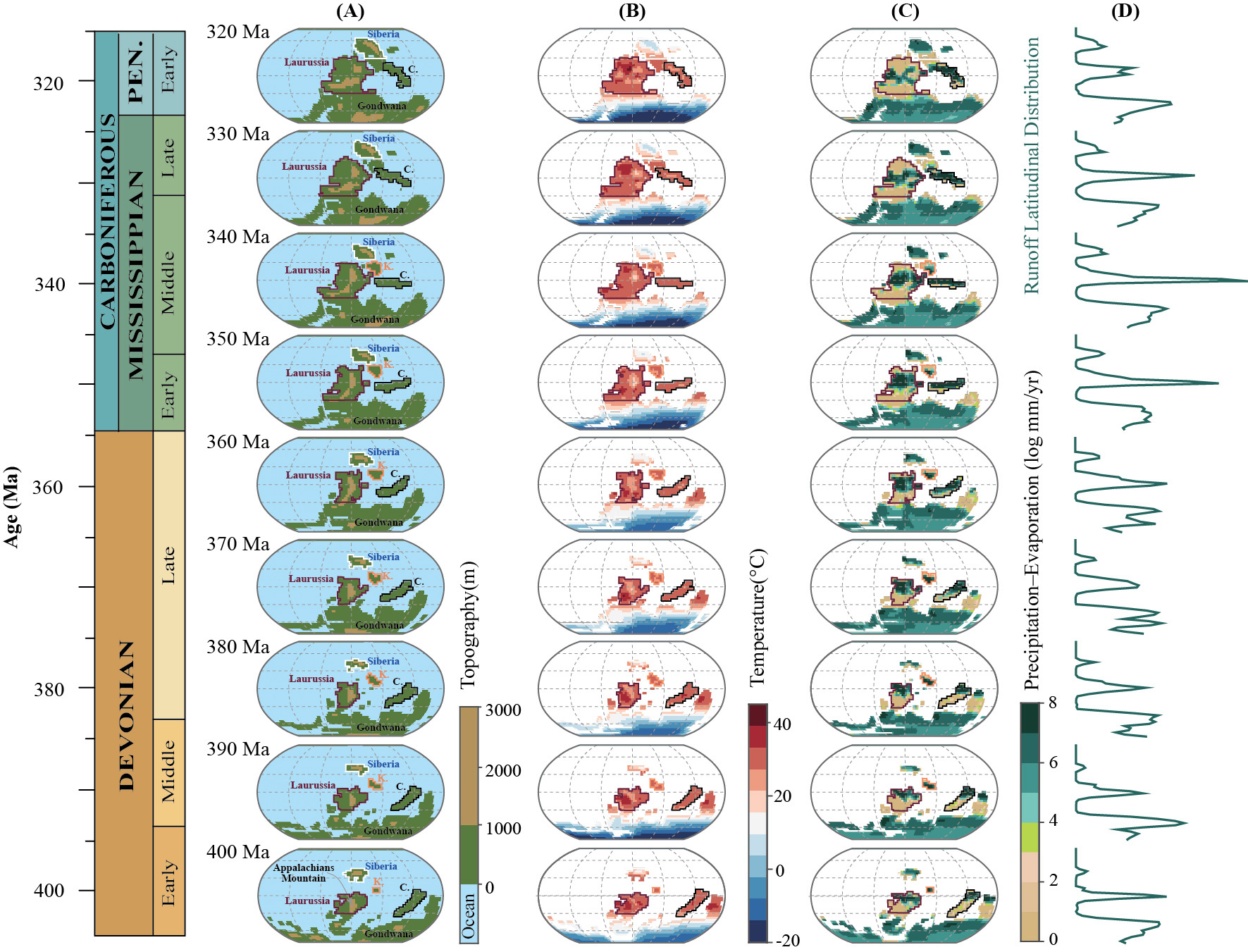 图1. 400–320 Ma古地理格局演变的气候影响(2800ppm大气CO2强迫下的CESM模拟结果)