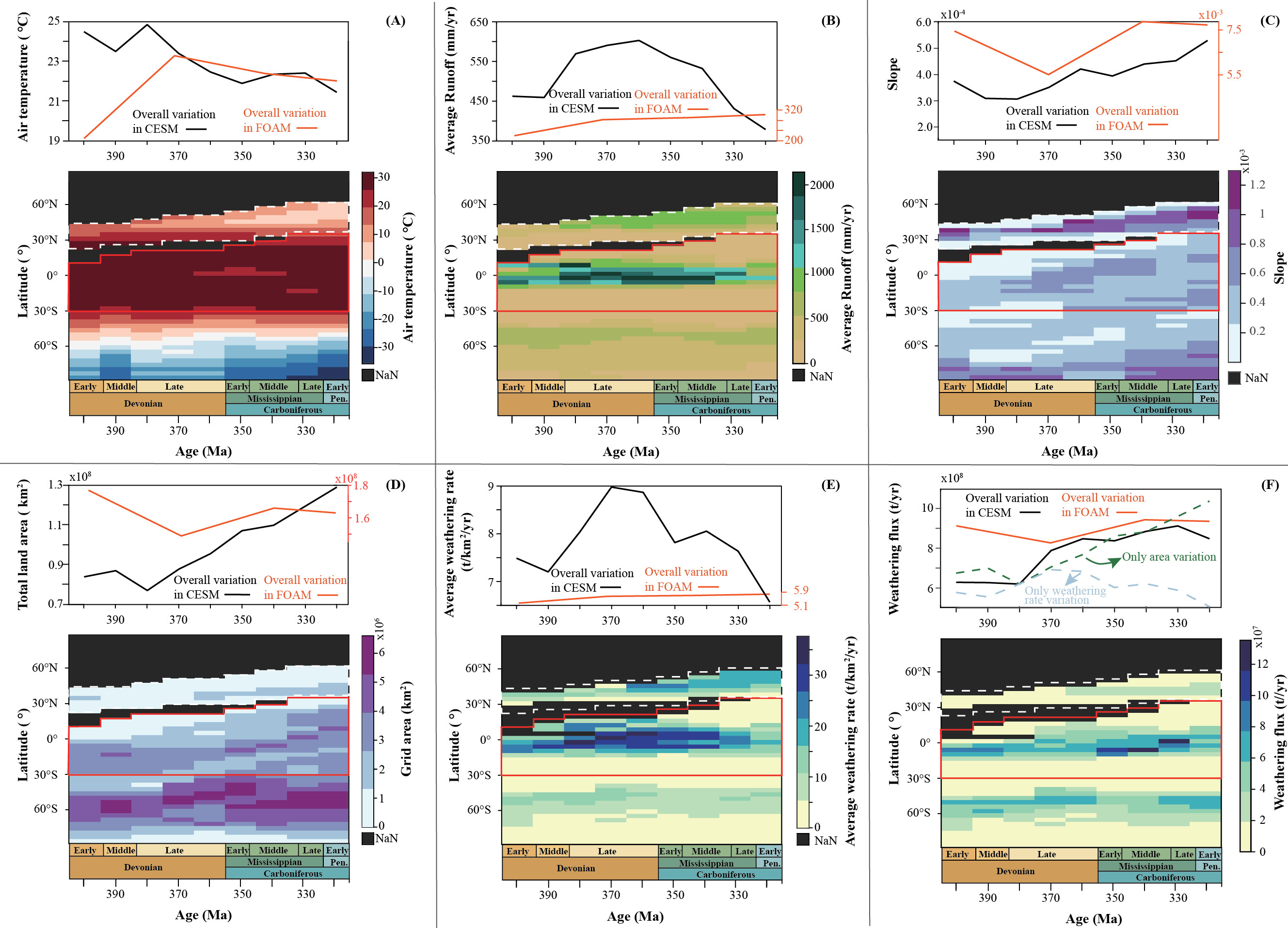 模拟结果显示,泥盆纪中晚期,伴随着泛大陆的聚合,地球经历了一次长期的全球海平面下降(海退)。得益于分辨率的提高,新的CESM-SCION模型量化了这一过程的双重冷却效应,即:海退引起的全球大陆的暴露面积显著增加(图2),一方面,通过增强地表反照率降低了气温(图2A和2D);另一方面,极大地扩大了硅酸盐风化的区域,进而增强了全球硅酸盐风化通量(图2F),加速了大气二氧化碳的消耗(图3),从而推动全球变冷(图4)。这一结果不仅复现了中-晚泥盆纪从温室气候向冰室气候的关键转变,还提出了“构造驱动的海退先于冰期,并驱动了晚古生代大冰期”的新观点。