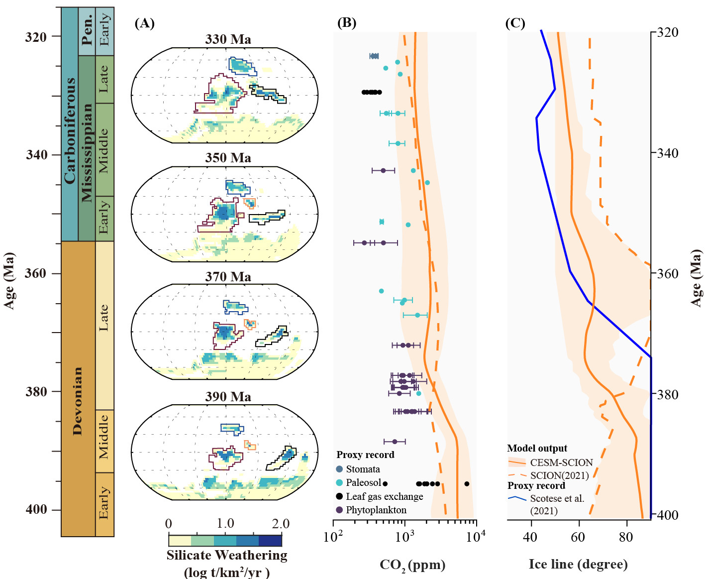 为了验证新模型的可靠性,研究团队选取了显生宙持续时间最长的冰室事件——晚古生代大冰期(LPIA)作为“试金石”。在以往的研究中,尽管低时空分辨率的SCION模型考虑了维管植物登陆扩张和泛大陆的聚合造山等导致硅酸盐风化作用增强的机制,但始终无法复现出中-晚泥盆纪发生的温室气候向冰室气候的转变。而通过利用新创建的CESM-SCION模型,研究团队成功捕捉到了被以往模型所忽视的关键驱动机制——构造驱动的陆地面积变化对地球表层“可风化性”以及地表反照率的关键控制(图2)。