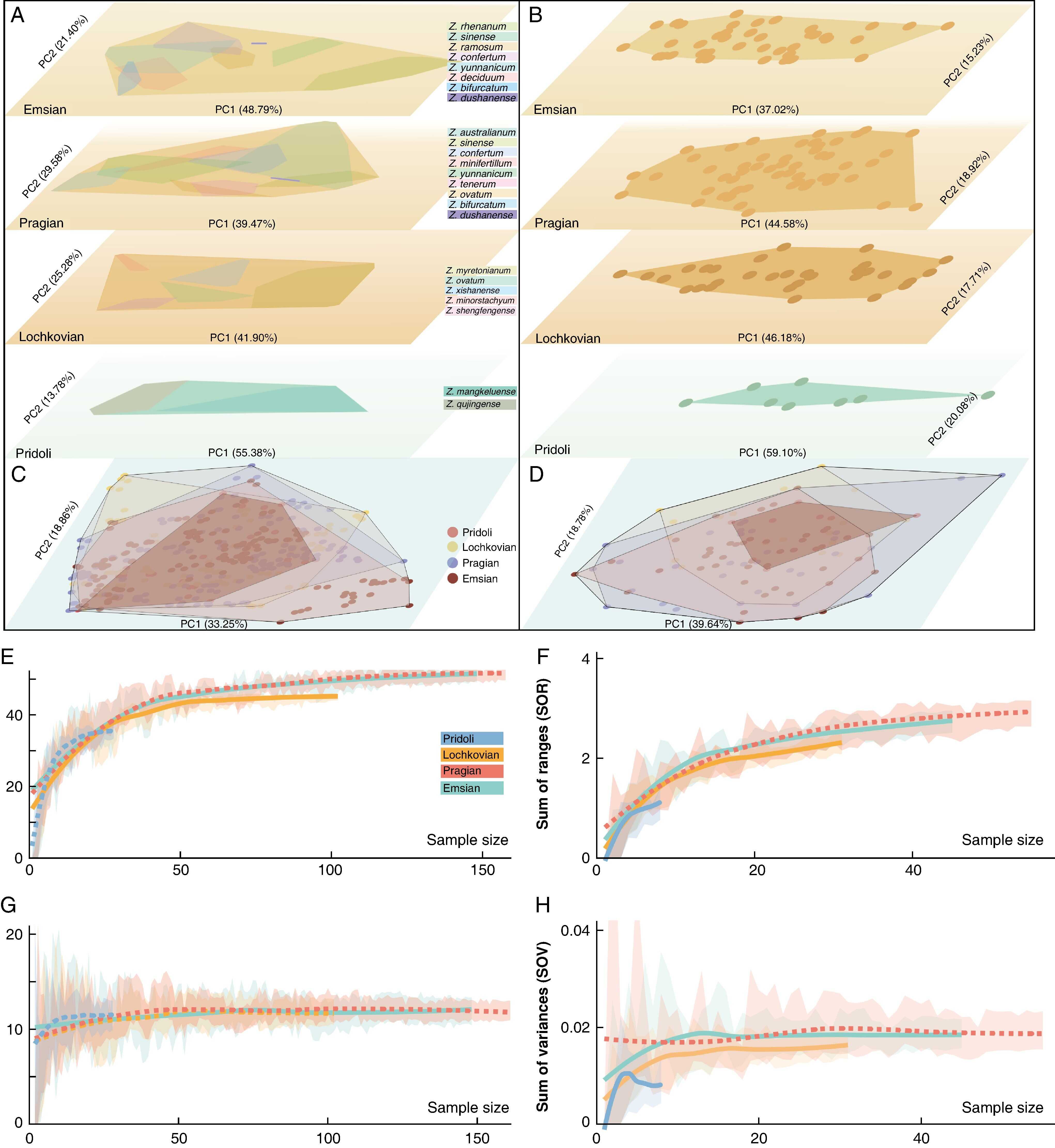 工蕨属植物整体(A, C)与孢子囊(B, D)形态空间及稀疏化(E-H)分析