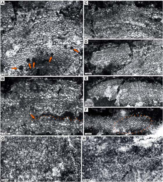 此次研究共识别出三种代表性层孔海绵。其中,新种东卡泡沫层孔海绵(Cystostroma dongkaense sp. nov.)以采样地西藏班戈东卡错命名,用以指示其原产地来源;另一新种葛静蜂巢层孔海绵(Ecclimadictyon gejingae sp. nov.)则以参与西藏野外科考并提供重要协助的南京古生物所科研助理葛静命名,以表达对其在高原艰苦环境中支持科研工作的致谢;此外,还确认了既有物种石阡网格层孔海绵(Clathrodictyon shiqianense Dong and Yang, 1978)在该区的存在。该化石群整体以网孔型层孔海绵为主,展现出典型的志留纪早期的灾后恢复型礁生物群结构特征。