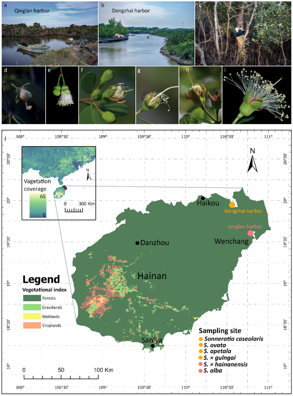 本研究选取海桑花粉为研究材料(图1),海桑属(Sonneratia)隶属于千屈菜科(Lythraceae),被认为是被子植物分类系统(APG)中基干类群。该属目前共包含约9个物种,其中中国沿海分布6种,其中S. apetala于上世纪被引入中国。此外,海桑属内存在较为复杂的杂交现象,例如S. × gulngai被认为是S. caseolaris与S. ovata的杂交种,而S. × hainanensis则被认为起源于S. alba与S. ovata的杂交种。由于上述系统位置的特殊性及自然杂交的存在,不同研究方法对海桑属系统学关系的解析结果并不完全一致,其S. caseolaris与S.× gulngai在基于分子生物学的ITS与ISSR系统树中均处于较为接近的分支位置,而S. × hainanensis与S. alba及S. ovata显示出较近的亲缘关系。在生物地理分布方面,海桑属物种表现出显著的差异。S. alba的分布范围最为广泛,自东非、马达加斯加及红海沿岸,经印度洋和孟加拉湾,一直延伸至东南亚群岛、新几内亚、密克罗尼西亚、所罗门群岛及西太平洋诸岛S. caseolaris的分布范围相对较窄,主要见于印度、孟加拉湾以及东南亚大陆和岛屿地区,并向东延伸至新几内亚。S. ovata的分布较为局限,主要集中在印度—马来西亚区域,尤其是马来群岛一带。S. apetala的分布最偏北,主要分布于孟加拉湾及中南半岛北部,在中国海南省仅有零星记录。杂交种S. × hainanensis的分布则极为局限,仅发现于海南省文昌地区。海桑属不同物种在潮间带的位置梯度上具有明确的生态适应分异,对盐度及淹水频率等环境因子的适应范围存在差异。因此,如果在地层沉积的化石记录中实现海桑属内花粉的种一级鉴定,对恢复地史期间的优势红树林群落结构及其空间分布具有重要意义,并可为古盐度变化及海平面波动提供关键的解释证据。